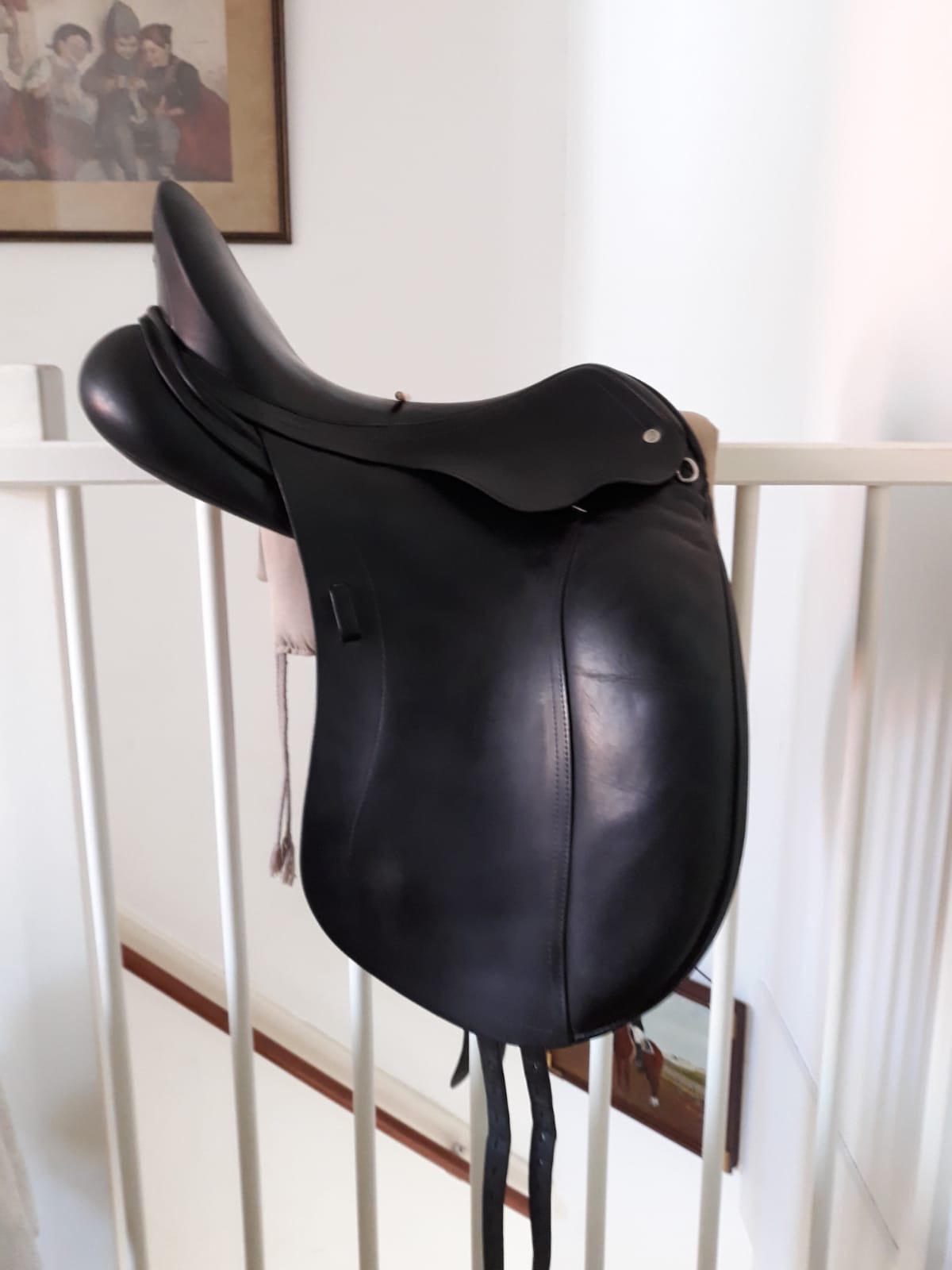 Het zadel heeft gelegen op een rondgeribt paard met een hoge schoft. Het is geschikt voor een paard met een licht omhooglopende rug. Ik heb het in 2015 tweede hands gekocht en het is altijd in onderhoud geweest bij een officiele Schleese saddel fitter. Het zadel is met een schoudervrijheidpanel en hoog kussen achteraan. Het zadel is van 2010.