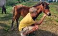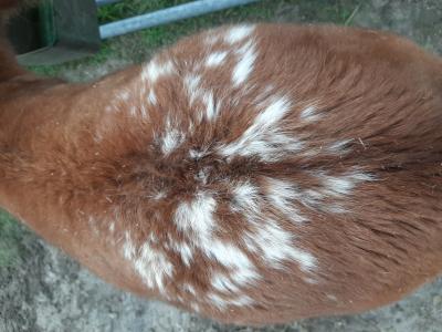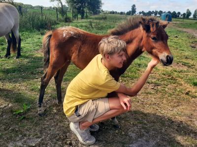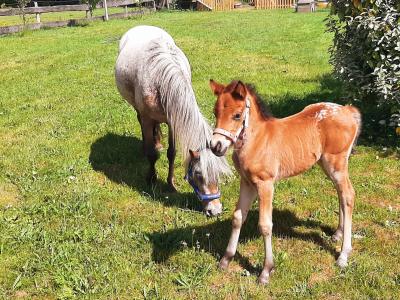 Lief merrieveulen, bruin schabrakbont. Verwachte stokmaat 1.15m.