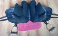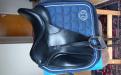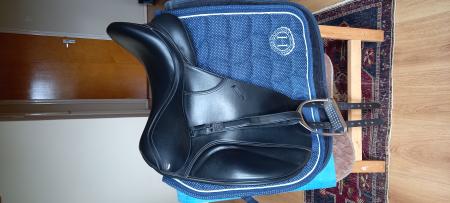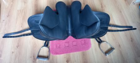 Wolgevuld deels leer dressuurzadel, verwisselbaar kopijzer, nu blauw.