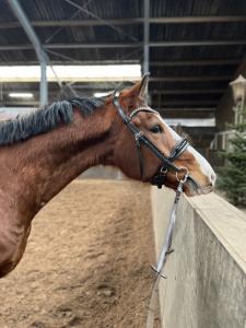Frits is een vrolijke ruin van 5 jaar oud. Hij is allround gereden, fijn te rijden met mooie ruime gangen. Hij is basis dressuurmatig gereden, gaat wekelijks mee op buitenrit, zowel alleen als met andere paarden. Hij is hierbij braaf, zowel in het bos als langs de weg. Ik zou wel zeggen dat hij hierin nog niet geschikt is voor een beginnende ruiter. Hij doet niets geks maar heeft nog niet de kilometers in de benen om te zeggen dat het een geschikt paard is voor een beginnende/onzekere ruiter. Hij heeft los en onder het zadel wat sprongen gemaakt. Hij maakt een prima sprong alleen hier ligt niet zijn talent, dat is ook de reden van verkoop. Hij heeft ook een aantal cross hindernissen gesprongen. Dat deed hij erg braaf. Hij is verschillende keren mee geweest op vreemd terrein en gaat geregeld mee naar clubles. Frits is ook bekend met werken aan de dubbele lange lijnen en grondwerk. Ik denk dat hij het ook leuk voor de wagen zou doen maar hij is hierin niet opgeleid.