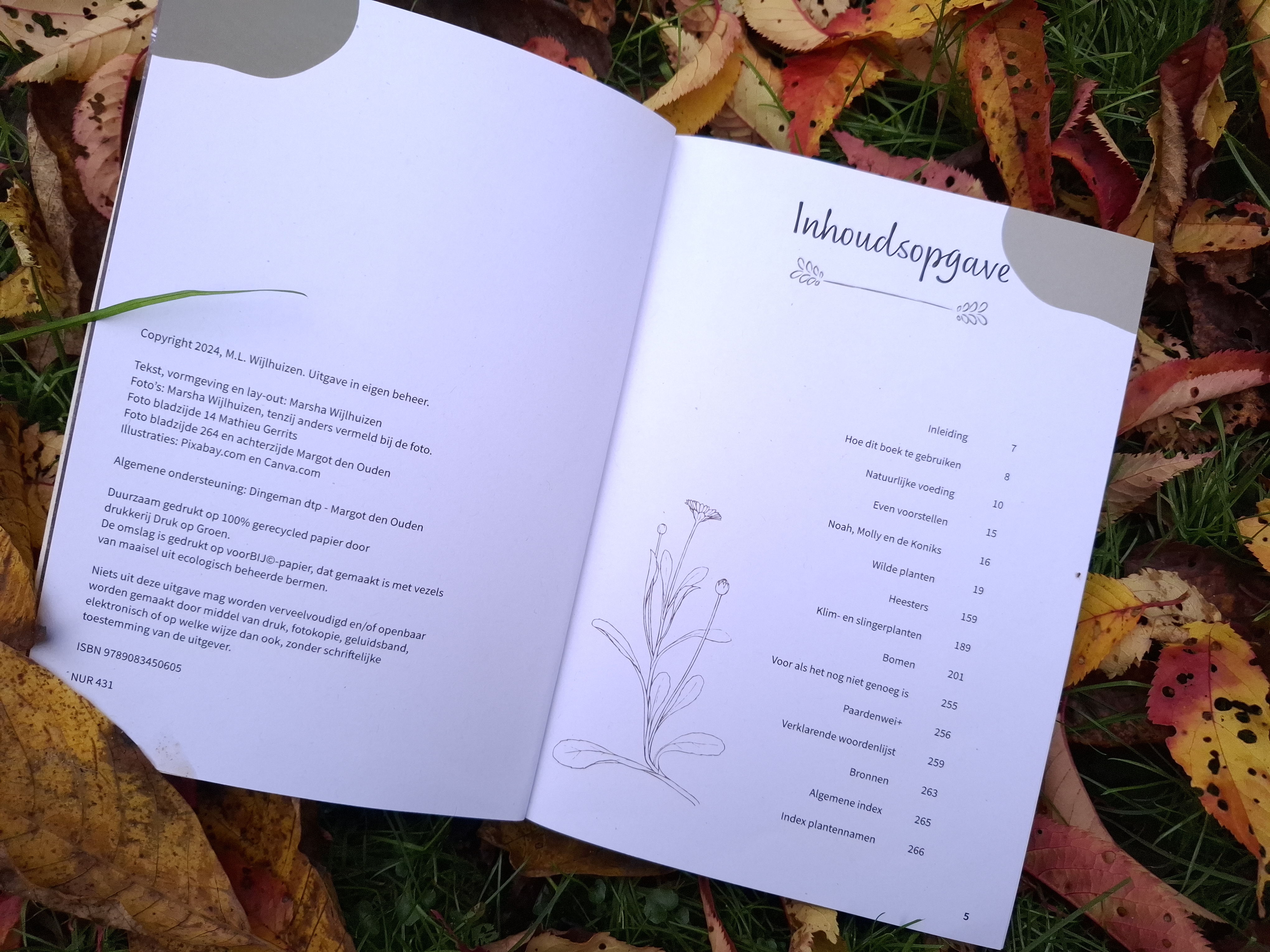 Opzoek naar een compleet naslagwerk over eetbare planten voor paarden?Tijdens onze gezamenlijke boswandelingen struinen mijn paarden door het vele groen. Ze eten van sommige planten en laten andere links liggen. Het is fascinerend om te zien hoe ieder zijn eigen voorkeur heeft. Gedomesticeerde paarden hebben nog steeds het instinct van hun wilde voorvaderen en het eten van verschillende planten hoort tot hun natuurlijke eetpatroon.Deze planten herkennen is niet altijd eenvoudig en daarom worden er in dit boek ruim 100 wilde planten, heesters, klim- en slingerplanten en bomen uitgebreid besproken. Onder andere hoeze zijn te herkennen, waar ze groeien en waarom de paarden ze eten.Kortom: een uitgebreide handleiding om samen met je paard de boeiende plantenwereld te ontdekken.Paperback, 270 fullcolor pagina’s, 148 x 210 mm€ 34,95 inclusief btw, exclusief verzendkosten.Te bestellen via mijn website! www.marshawijlhuizen.nl