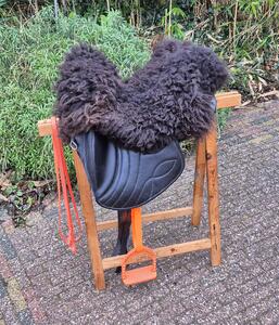 Ghost buttera piccolo inclusief: Oranje beugelriemen, oranje teugels, oranje beugels en een bruine seatsaver van echt wol. En uiteraard een zadelhoes. De seatsaver vormd zich helemaal naar het zadel.