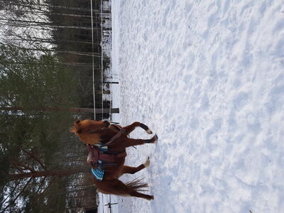 Ze vindt buitenrijden ook heerlijk, is kalm en goed verkeersmak. Ze schrikt niet snel en is ook goed alleen te rijden buiten. Ze is prettig voorwaards met rijden maar heel licht in de mond en op de hulpen.
