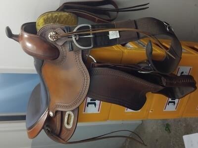 Freemax boomloos zadel 16 inch westernmaat, ca 18 inch engels. Forkmaat 5 (wisselbaar) met bruine FRA singel van 80cm. Eventueel gratis dekje met inlagen erbij maar die is in slechte staat. Heeft wat leerschade maar is verder in zeer goede staat.